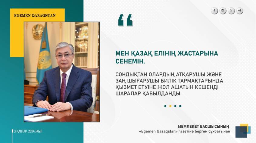 «Мен қазақ елінің жастарына сенемін. Сондықтан олардың атқарушы және заң шығарушы билік тармақтарында қызмет етуіне жол ашатын кешенді шаралар қабылданды. Президенттік жастар кадр резерві жасақталды. Іріктеудің бірнеше сатысынан өткен кәсіби жас мамандар мемлекеттік қызметте басшылық лауазымдарға тағайындала бастады.
