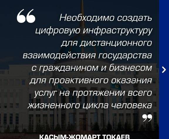 «С помощью цифровых технологий мы намерены максимально облегчить повседневную жизнь граждан и добиться равенства возможностей для всех. Для этого предстоит перейти к качественно новому формату цифровизации госуправления. Его суть заключается в том, что главный фокус государственной политики сосредоточен на человеке, его нуждах и интересах», – Президент РК Касым-Жомарт Токаев.