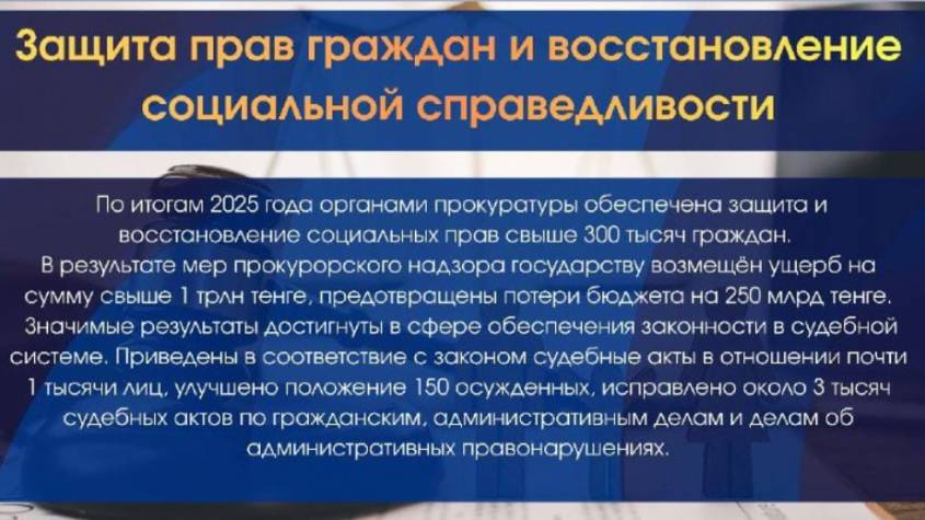 По итогам 2025 года органами прокуратуры обеспечена защита и восстановление социальных прав свыше 300 тысяч граждан. В результате мер прокурорского надзора государству возмещён ущерб на сумму свыше 1 трлн тенге, предотвращены потери бюджета на 250 млрд тенге. Значимые результаты достигнуты в сфере обеспечения законности в судебной системе. Приведены в соответствие с законом судебные акты в отношении почти 1 тысячи лиц, улучшено положение 150 осужденных, исправлено около 3 тысяч судебных актов по гражданским, административным делам и делам об административных правонарушениях.