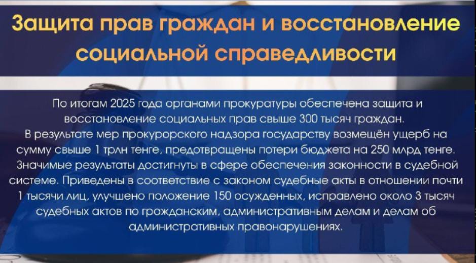По итогам 2025 года органами прокуратуры обеспечена защита и восстановление социальных прав свыше 300 тысяч граждан. В результате мер прокурорского надзора государству возмещён ущерб на сумму свыше 1 трлн тенге, предотвращены потери бюджета на 250 млрд тенге. Значимые результаты достигнуты в сфере обеспечения законности в судебной системе. Приведены в соответствие с законом судебные акты в отношении почти 1 тысячи лиц, улучшено положение 150 осужденных, исправлено около 3 тысяч судебных актов по гражданским, административным делам и делам об административных правонарушениях.