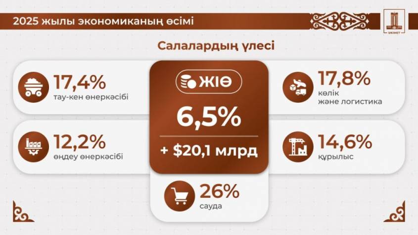 В целом, рост ВВП за 2025 год составил 6,5%. Экономическую динамику обеспечило ускоренное развитие ключевых отраслей: транспорт вырос на 17,8%, строительство – на 14,6%, горнодобывающая промышленность – на 17,4%, обрабатывающая промышленность – на 12,2%, торговля – на 26% и сельское хозяйство – на 5,9%.
