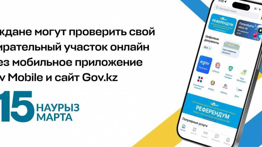 В преддверии республиканского референдума, который пройдет 15 марта, для граждан доступен цифровой сервис по поиску своего избирательного участка. Найти нужный пункт для голосования можно в несколько кликов в мобильном приложении eGov Mobile и на портале GOV.KZ.