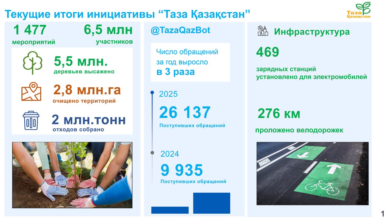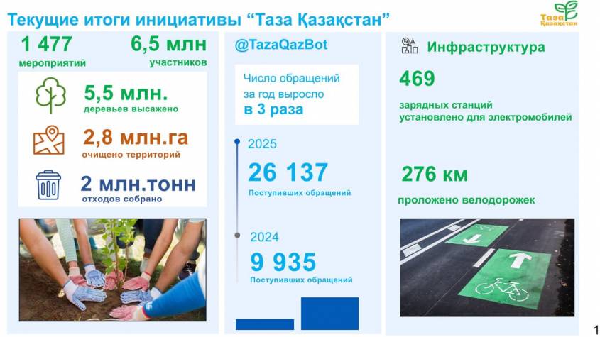 Как сообщил министр экологии и природных ресурсов Ерлан Нысанбаев, за два года реализации инициативы Главы государства «Таза Қазақстан» по всей стране проведено 1,5 тыс. экологических мероприятий, в рамках которых собрано 2 млн тонн отходов и высажено порядка 5,5 млн деревьев