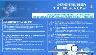 «Ерекше білім беру қажеттіліктері бар балаларды кешенді қолдау туралы» Заң жобасы әзірленуде, ол отбасы мен баланы сүйемелдеуге бағытталған ведомствоаралық тетіктерді қамтитын болады. Үздіксіз инклюзивті білім берудің ұлттық орталығын құру бойынша жұмыстар жүргізілуде. Еліміздегі мектептердің 90%-ин инклюзивті білім алу үшін жағдай жасалған, ал балаларды арнайы психологиялық-педагогикалық қолдаумен қамту 85%-ға жетті жетті.…